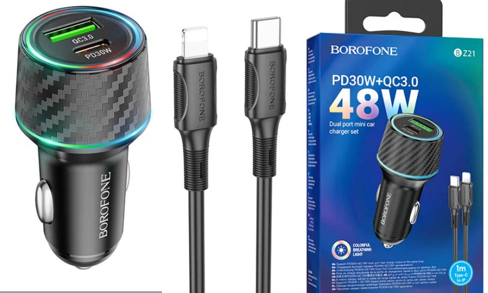 АЗУ BOROFONE BZ21, 48W QC 3.0 с кабелем Type-C- lightning
