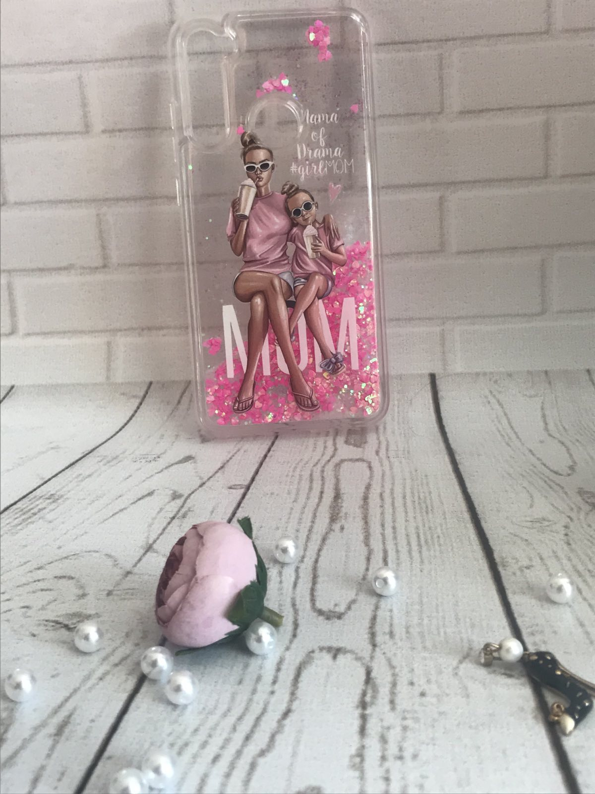Накладка для SAMSUNG A21 (A215), Жидкие блестки, сердечки, Девушка с дочкой с коктейлем