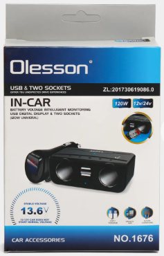 Переходник в прикуриватель (1676) на 2 ЗУ, 2 USB, Olesson