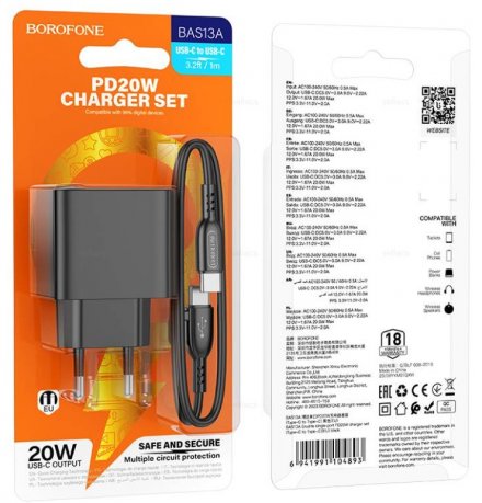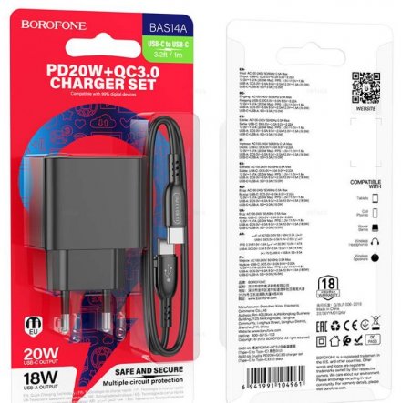СЗУ BOROFONE BAS74A PD20w 3.0A 1USB C с кабелем TYPE C на TYPE C