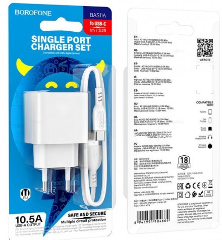 СЗУ BOROFONE BAS11A, 1USB с кабелем TYPE C