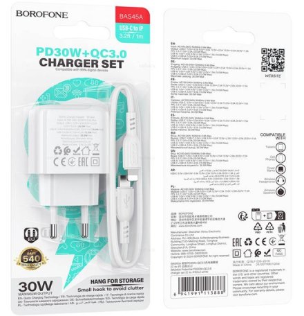 СЗУ BOROFONE BAS45A, PD30W USB C с USB с кабелем TYPE C на Lightning QC3.0