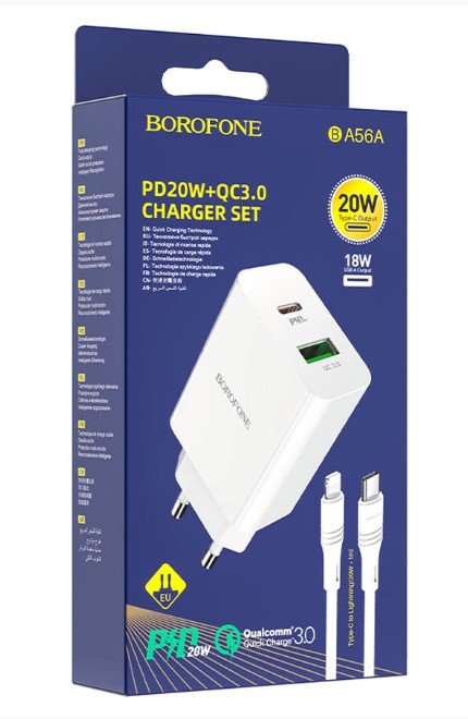 СЗУ BOROFONE BA57A PD + Quick Charge 3.0 Type-C 3A + кабель Lightning-Type-C