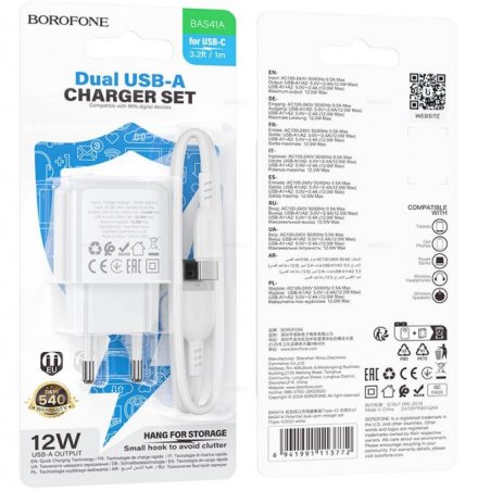 СЗУ BOROFONE BAS41A 2.4A 2USB,кабель TYPE-C