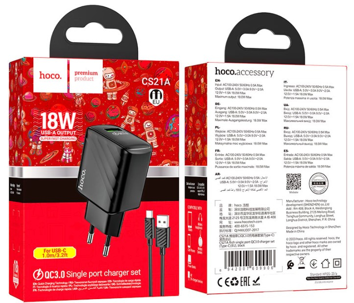 СЗУ Hoco CS21A 18w 3.0A 1USB с кабелем micro