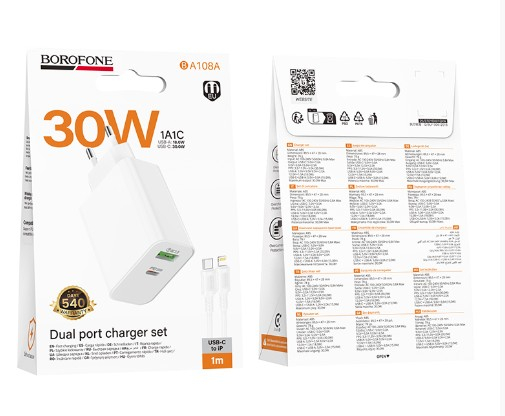 СЗУ BOROFONE BA108A Stellar 1USB 1USB C с кабелем Type C Lightning, 3A, 30W