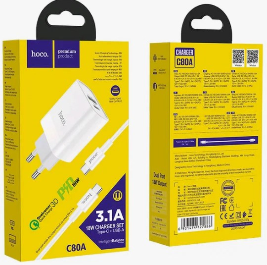 СЗУ HOCO C80A Plus 3A 1USB + кабель Type-C-Type-C