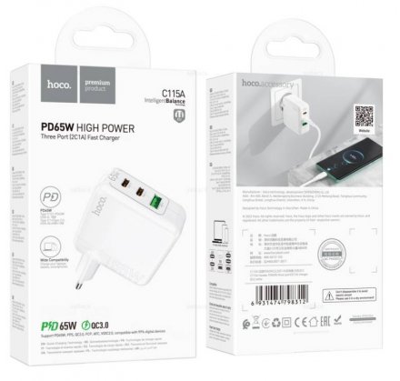 СЗУ HOCO C115A, PD65W, Header 1USB, 2USB C, 3A, 65W